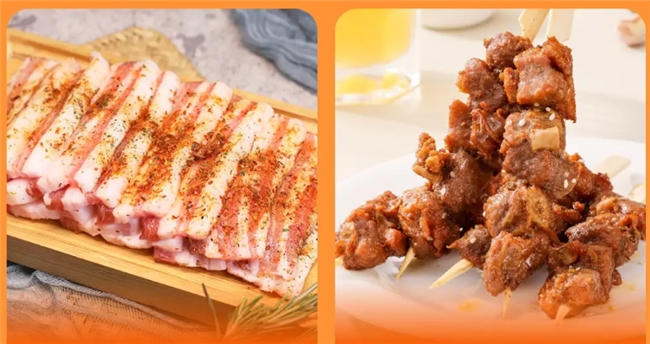 作为北派烧烤的代表之一,东北烧烤讲究实在与过瘾。七鲜烧烤大油边串酥香弹嫩,口口爆汁,230g装仅售19.9元/盒,完美复刻齐齐哈尔街头风味。沈阳西塔风味辣烤牛五花咸香微辣,搭配生菜、蒜片、辣白菜,轻松复刻网红烤肉店味道。延边风味厚切黑猪五花肉肥瘦均匀,香而不腻;厚切黑猪梅花肉片呈雪花纹理,烤后直接吃或用生菜包裹皆宜。长春花椒盐风味牛肉串选用牛后腿肉,以青花椒与盐黄金配比,麻香咸鲜。内脏爱好者可选香烤牛肚、爆汁烤牛肠和烧烤千层筋串,价格低至9.9元起,适配夜宵解馋与亲友小聚。