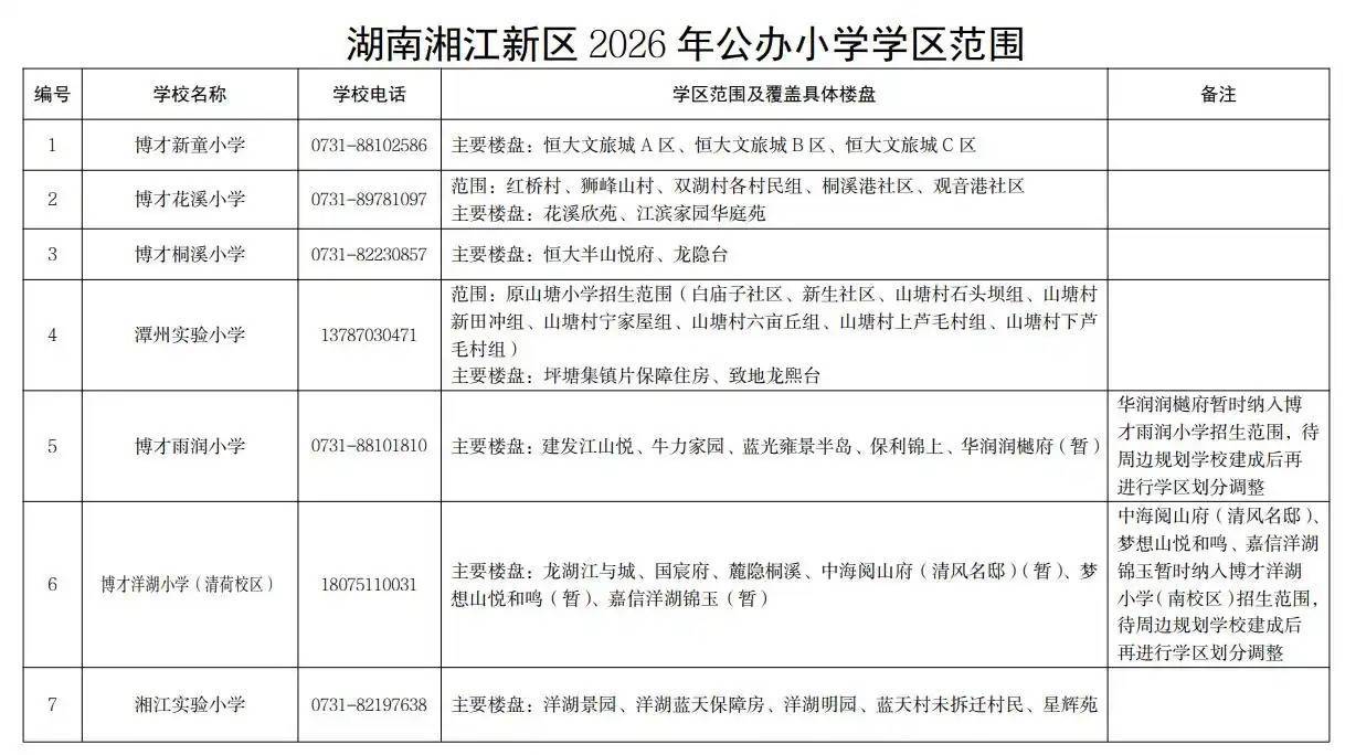 红网时刻新闻4月1日讯(通讯员 胡谦)4月1日上午,记者从湖南湘江新区教育局获悉,“长沙市普通中小学入学报名系统”网上报名已正式开通。为保障广大市民对湖南湘江新区公办小学学区划分的知情权,新区发布了《关于2026年湖南湘江新区公办小学学区范围及覆盖具体楼盘信息的公告》。据悉,湘江新区公办小学学区划分由湘江新区教育局负责,由新区教育行政管理部门根据区域内教育规划布局、历史沿革、办学规模、周边生源和交通状况等因素,按相对就近原则,合理划分每所小学的学区范围。已交房但未划分学区的新建楼盘需由开发商到新区教育局提出学区划分申请,经区教育局核定其教育配套责任后再进行学区划分或调剂入学。学区划分中所指的楼盘、宿舍等均指住宅性质的房产,非住宅性质房产不作入学依据。此外,学区内由于生源增长导致容量不够,不能完全接纳本学区适龄儿童(少年)入学的,由区教育行政管理部门按照生源排序和相对就近的原则统筹安排。目前,“长沙市普通中小学入学报名系统”网上报名已正式开通,报名截止日期为4月15日。对新区公办小学学区划分及入学政策有疑问的,可咨询湖南湘江新区管理委员会教育局基础教育处(0731-88999272、88999894)或各学校。举报/反馈
