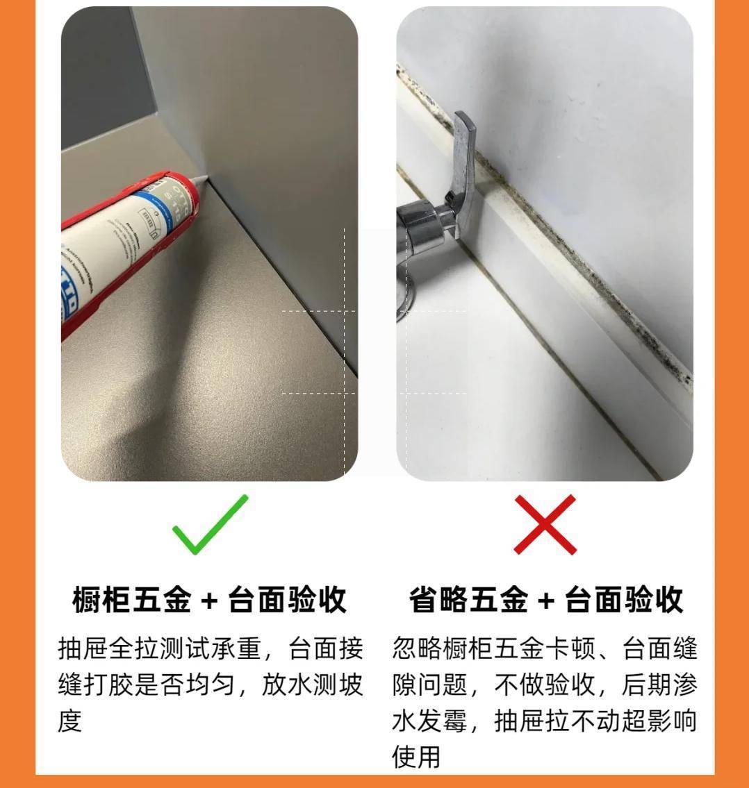 角阀:擦拭每个水龙头的角阀(水管和台盆连接处),若纸巾变湿,说明密封不佳,后期必定会渗水;台盆下水:在台盆中接半盆水,观察下水口与台面的接口处,若有渗水现象,时间一长橱柜容易发霉;阳台/浴室柜:同样采用接水法检测地漏与台面的衔接处,避免入住后才发现“墙角总是湿漉漉的”。三、收口打胶:该打胶的地方别偷懒,防霉防潮是关键“瓷砖缝打了美缝,应该没问题了吧?”这种想法不对!不同位置需要使用不同的胶:
