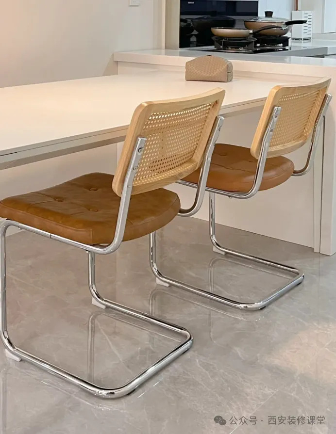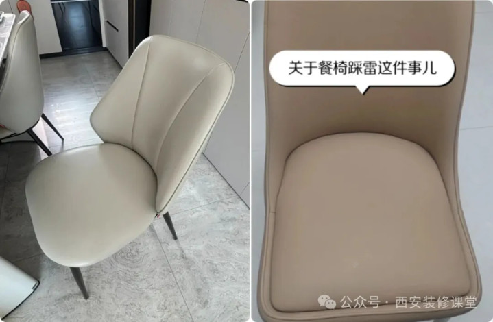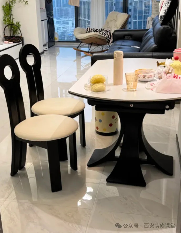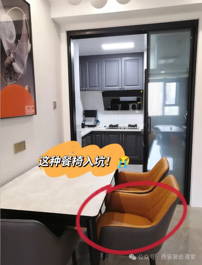 网友@奶油家:最好不要碰这种餐椅,软包范围太大,太容易脏了,特别是家里有孩子的,只要稍微蹭一蹭就黑一圈,而且压根擦不掉,时间久了压根看不到当初的本色了;弧度的靠背导致餐椅不用的时候无法完全塞进餐桌下方,靠近厨房位置导致过道非常狭窄。