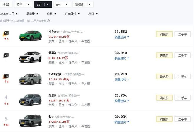 而就在这两天,十月份的汽车销量数据出炉,小米汽车真的是逆风翻盘,小米YU7凭借着33660台的销量数据登顶十月SUV销量榜的冠军。而它从上市到现在也才仅仅4个月的时间。它也算得上是创造了最快的销冠纪录。